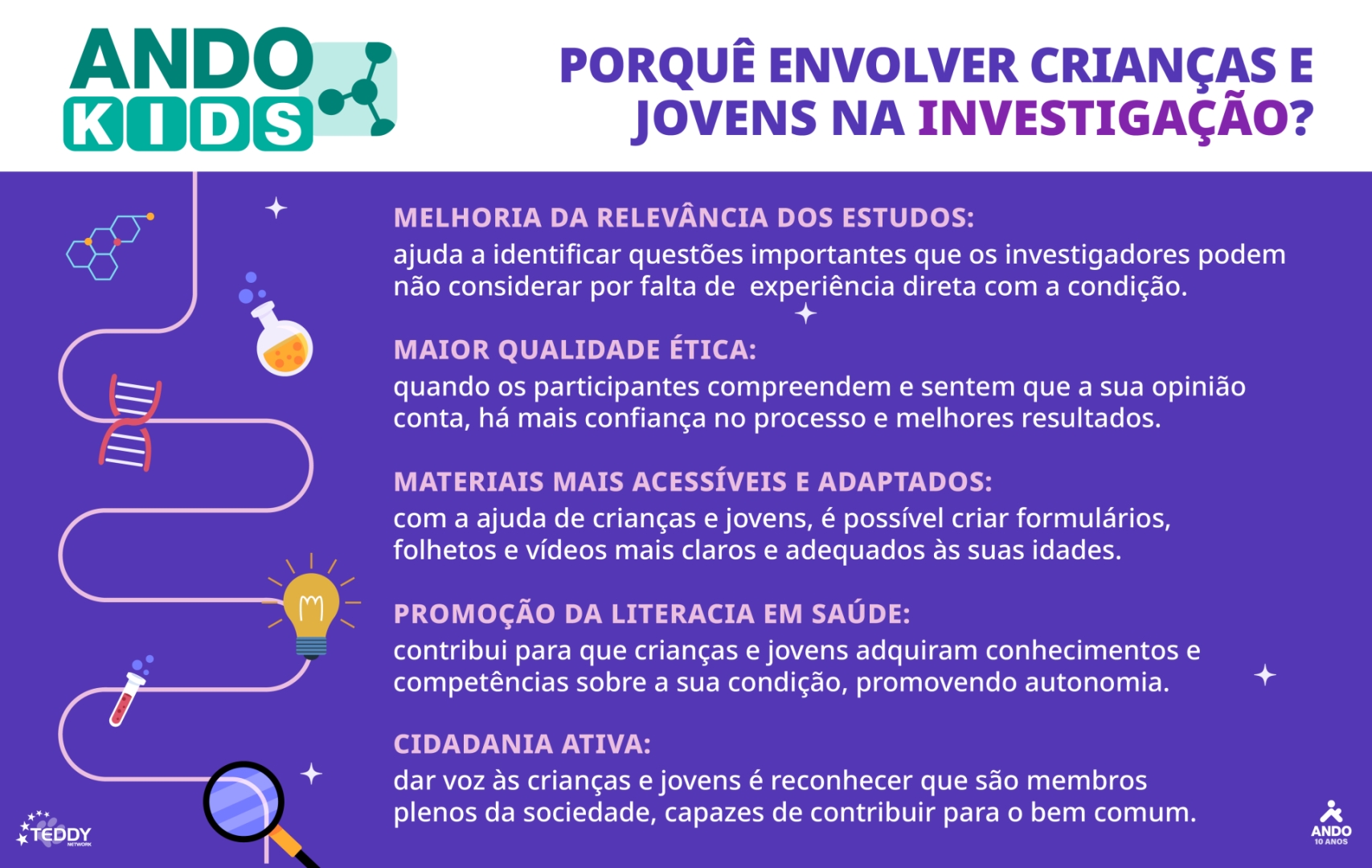A celebrar os 10 anos da ANDO, criamos a ANDO Kids onde falamos e aprendemos sobre investigação, cuidados de saúde e temas ligados a doenças raras e displasias ósseas. a ANDO kids é membro das redes europeias TEDDY Network, eYPAGnet e EPTRI.