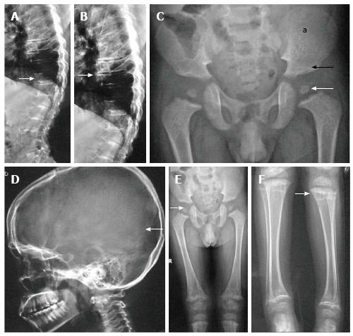Fig. 2. Radiografias laterais da espinha dorsolombar mostram platispondilia (seta, A) com espaços de discos intervertebrais gravemente reduzidos (seta, B). A radiografia da pélvis (C) mostra pequenas epífises femorais (seta branca), acetábulos horizontais (seta preta) e asas ilíacas curtas (a). A radiografia do crânio (D) mostra calvário relativamente aumentado (seta). As radiografias de membros inferiores (E, F) mostram fémures relativamente curtos e pequenas epífises com irregularidade metafisária secundária (seta, F). Fonte: World Jornal of Radiology |
