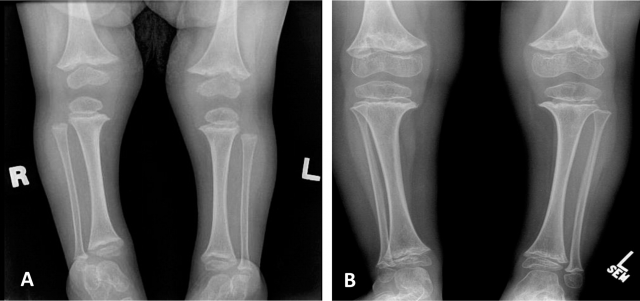 Fig.3. Radiografia das extremidades inferiores de criança com 2 (A) e 4 (B) anos de idade mostram alterações metafisárias típicas e lucências císticas irregulares de margens escleróticas e aparência fragmentada. |