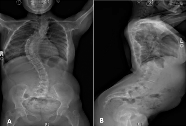 Fig.5. Vistas posterior e lateral da coluna vertebral aos 13 anos, mostram escoliose toracolombar multisegmentária com levoscoliose torácica superior, dextroscoliose torácica inferior e levoscoliose lombar. Fonte: Lymphosign.com |