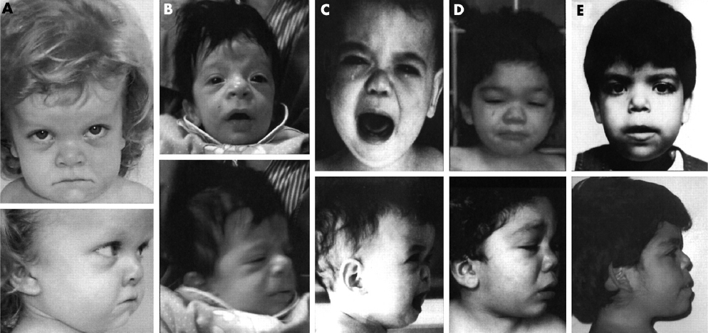 Diferentes idades. Note-se a testa proeminente, a ponte nasal baixa e o nariz curto com as narinas viradas para a fente.