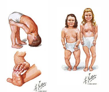 Escoliose e lordose pode ser observada na infância e persiste na vida adulta em cerca de 50% dos casos