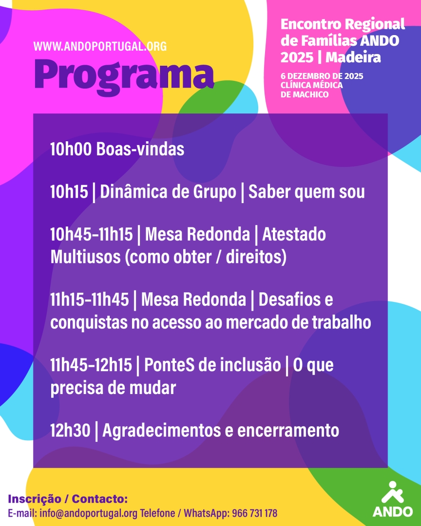 A ANDO Portugal, em conjunto com a sua Delegação na Madeira, convida famílias, pessoas com displasia óssea, cuidadores e demais interessados a participar no Encontro Regional de Famílias na Madeira. Este encontro pretende ser um espaço seguro e acolhedor de diálogo, onde é possível partilhar experiências, esclarecer dúvidas e refletir sobre desafios comuns.