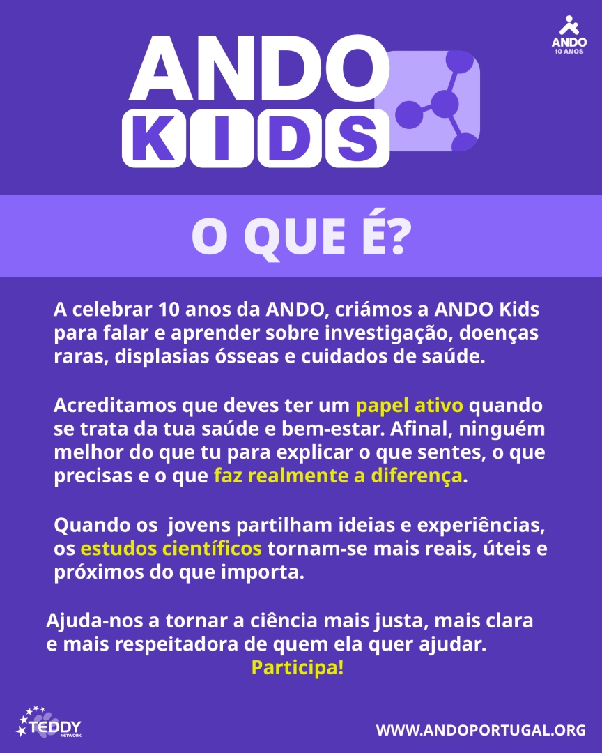 No ano em que a ANDO celebra o seu 10.º aniversário, temos o prazer de apresentar a ANDO Kids, uma iniciativa criada para dar voz a crianças e jovens no campo da investigação científica, doenças raras, displasias ósseas e cuidados de saúde.